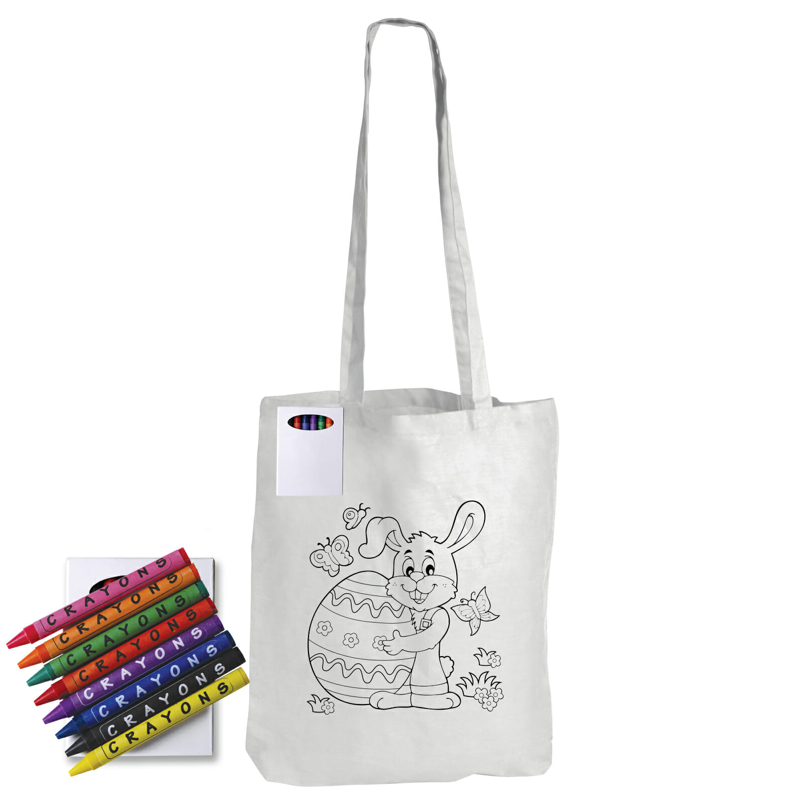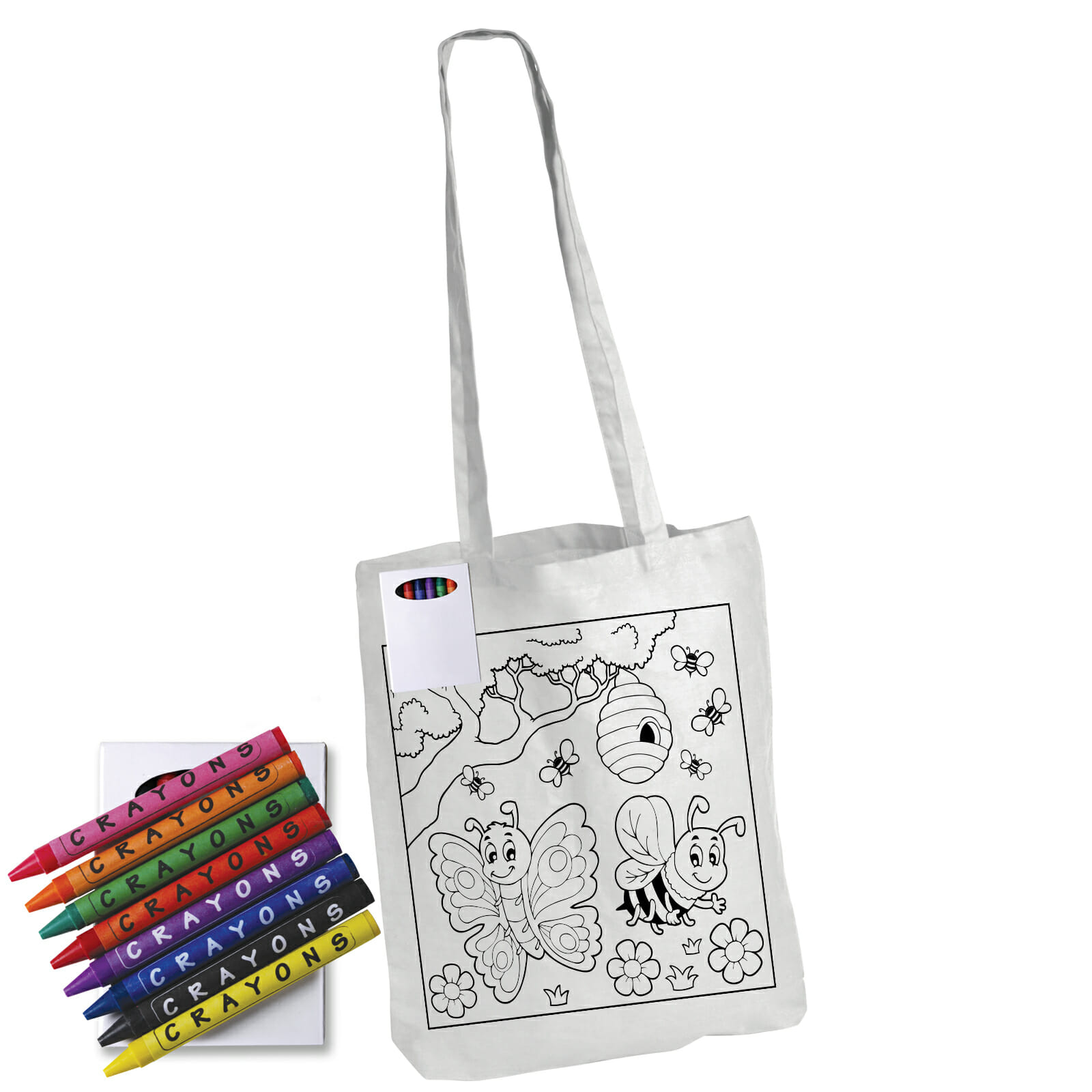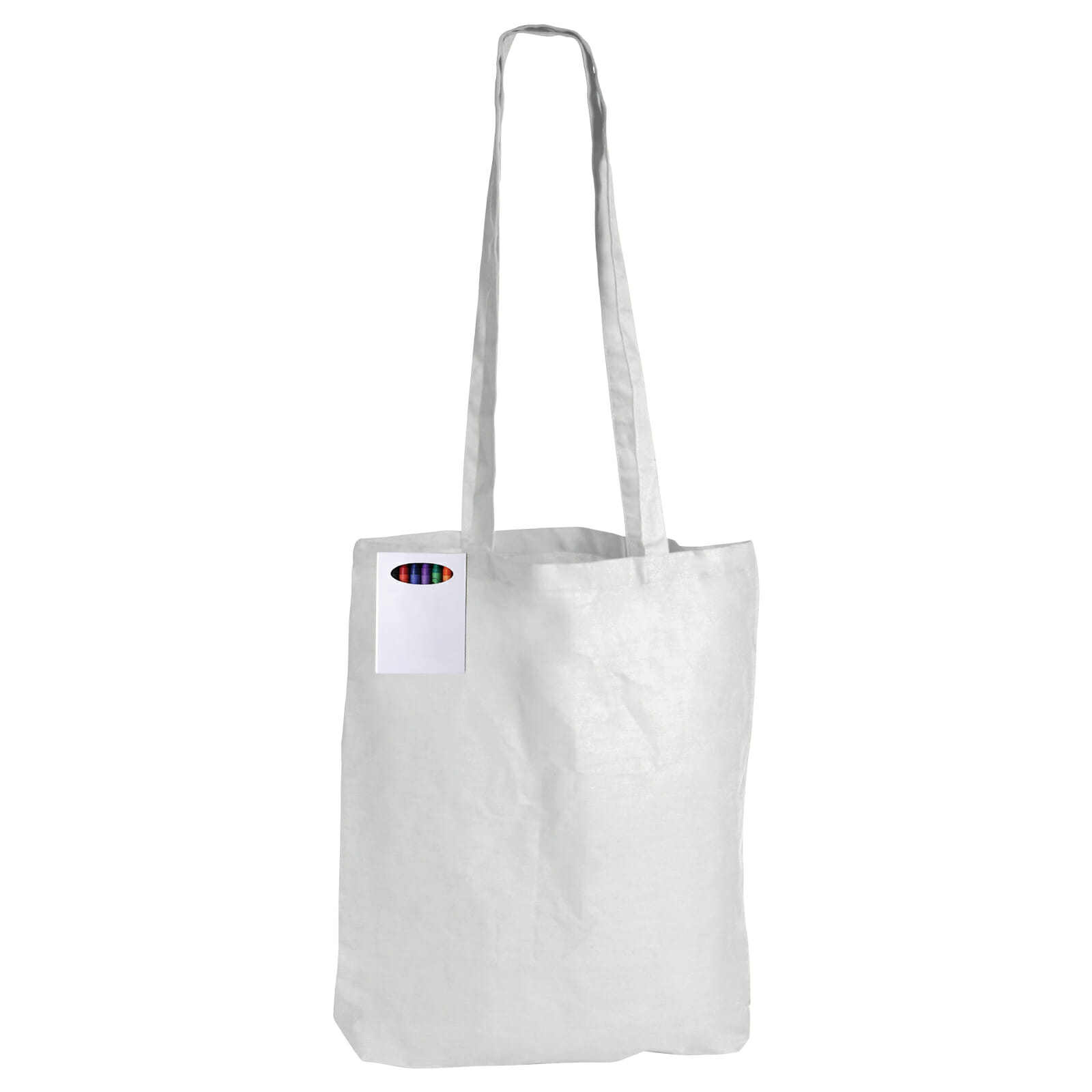 Your custom design printed on white cotton long handle cotton bag. Great colouring pack includes 8 assorted non toxic coloured wax crayons. Great for creating brand awareness in the younger generation.